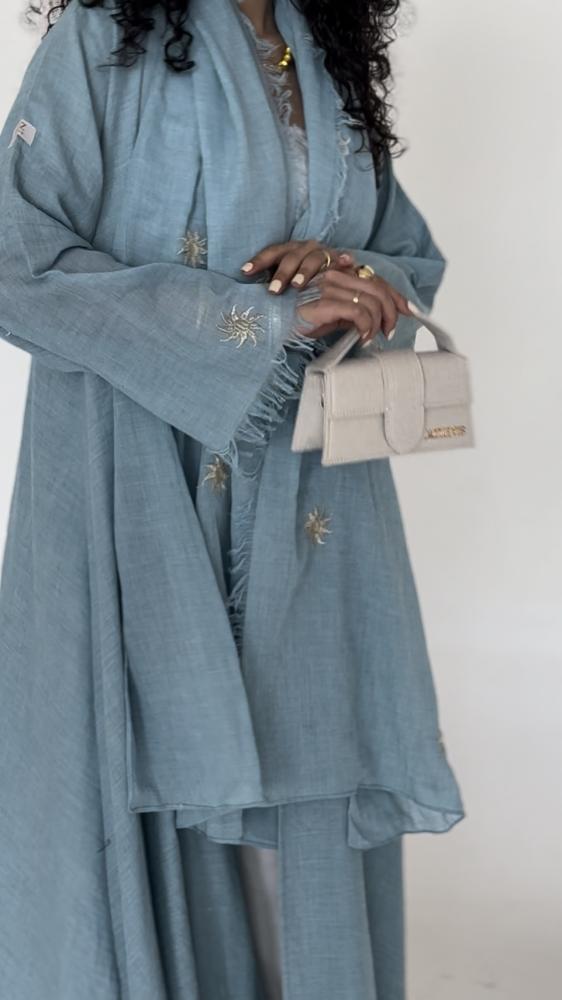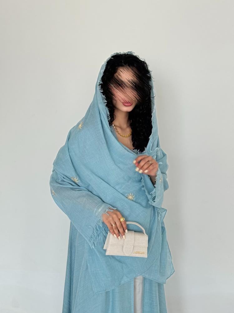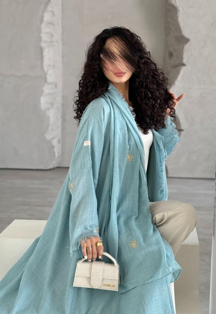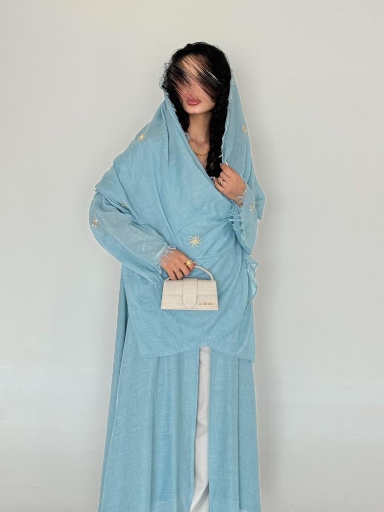 لون السماوي الفاتح من أبرز صيحات هذا الصيف، وعبايتنا تجي بقماش ناعم، خفيف، ومريح للجو الحار. مطرزة بخيط ذهبي شكل شمس على كامل الطرحه وأيضا كم العباية، مناسبة للمشاوير اليومية والطلعات الراقية.